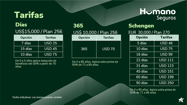 - Cobertura ¡Buen Viaje! 365 días o Schengen: EE. UU., Canadá y Puerto Rico: 1-877-278-3062
